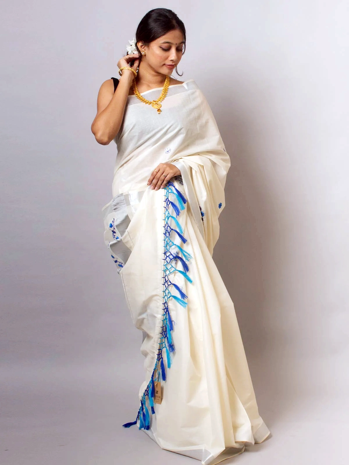 The Kerala Cotton Embroidered saree fusions traditional style with intricate embroidery, attract to those who value enduring beauty and cultural charm.